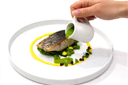 Per l’impiattamento, disporre le cime di rapa al centro del piatto, adagiare sopra il filetto di ombrina e completare con la crema di patate, distribuendola con lo squeezer per creare punti o decorazioni eleganti che diano movimento e armonia al piatto.