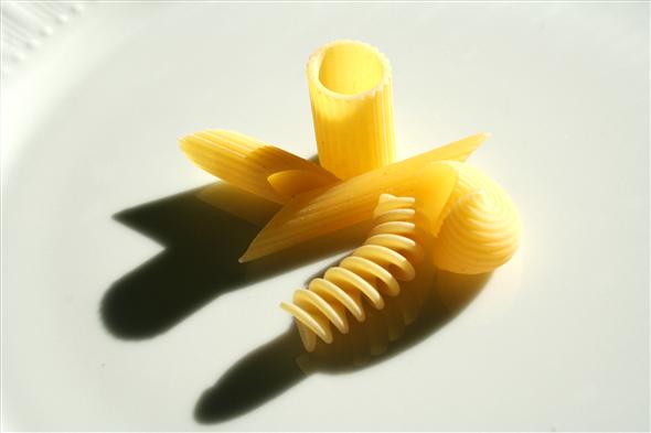 Una composizione di penne rigate, pipe, rigatone rigato e fusillo