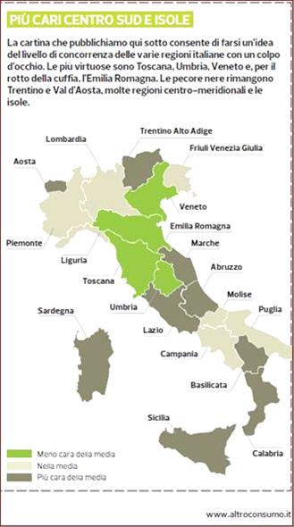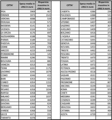 Si segnala inoltre che l'Abruzzo e' tra le regioni italiane meno virtuose in termini di concorrenza e, di conseguenza, una di quelle in cui si risparmia meno per fare la spesa quotidiana. Nel dettaglio a Chieti, su una spesa media annuale pari a 6.442 euro, passando dal punto vendita piu' caro al piu' economico della citta', si possono risparmiare fino a 846 euro; all'Aquila, su una spesa media di 6.442 euro, il risparmio puo' raggiungere i 772 euro; a Pescara su una spesa media di 6.470 euro se ne possono risparmiare al massimo 532. Il risparmio medio nazionale e' pari a 600 euro. In cima alla classifica c'e' Firenze (risparmio 1.522 euro), mentre la spesa media piu' bassa si registra a Pisa (5.969 euro); chiude la graduatoria Campobasso (110 euro).