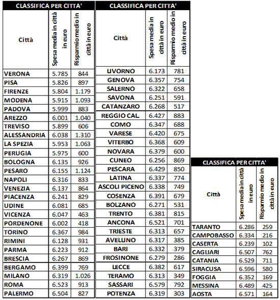 La novità - si legge in una nota -  è che quasi nessuna insegna offre più gli stessi prezzi su tutto il territorio nazionale. Ogni punto vendita si adatta all'offerta dei concorrenti più diretti. Maggiore è la dinamica concorrenziale, più numerose fioccano le offerte per il consumatore. Verona conquista la palma della città più conveniente d'Italia, dove è possibile trovare il supermercato dove fare la spesa-tipo al prezzo più contenuto in assoluto. Seguono Pisa e Firenze. Interessante balzo in avanti rispetto alle precedenti rilevazioni di Napoli, tredicesima in classifica e prima città del sud per risparmio, territorio che si conferma comunque avido di dinamiche concorrenziali e con livelli di prezzo più cari della media per Calabria, Sardegna e Sicilia.